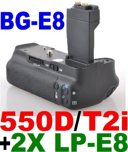 Includes TWO LP-E8 batteriesThis battery grip/holder is compatible with Canon EOS 550D/Rebel T2i SLR cameras. It has all the same functions as the original Canon BG-E8 battery grip. The grip has a built in vertical shutter release button, and can hold two LP-E8 lithium-ion battery packs, or six AA batteries using the included battery holder. Additionally, it supports features such as AE lock and FE lock, and retains access to the Index/Reduce button, main dial, AF-Point Select button, and Aperture/Exposure Compensation Buttons.Hold 6 AA batteries or 2 LP-E8 Li-ion batteries.Vertical shutter with half-press function. More comfortable vertical shooting.Professional edition with vertical-grip shutter-release button, main dial, AE-L button, Index/Reduce button and Exposure button.Tripod screw mount.Same functions as the original battery grip Canon BG-E5. High quality product with big discount from the original one.One Year WarrantySpecifications:Type: Battery grip for the CANON EOS 550D / Rebel T2iBattery pack LP-E8/6X AA BatteriesPower Switch: Camera's power switchColor: BlackDimensions: 130x75x105mmWeight: Approx. 395g. (without batteries and battery magazine)Customer Reviews